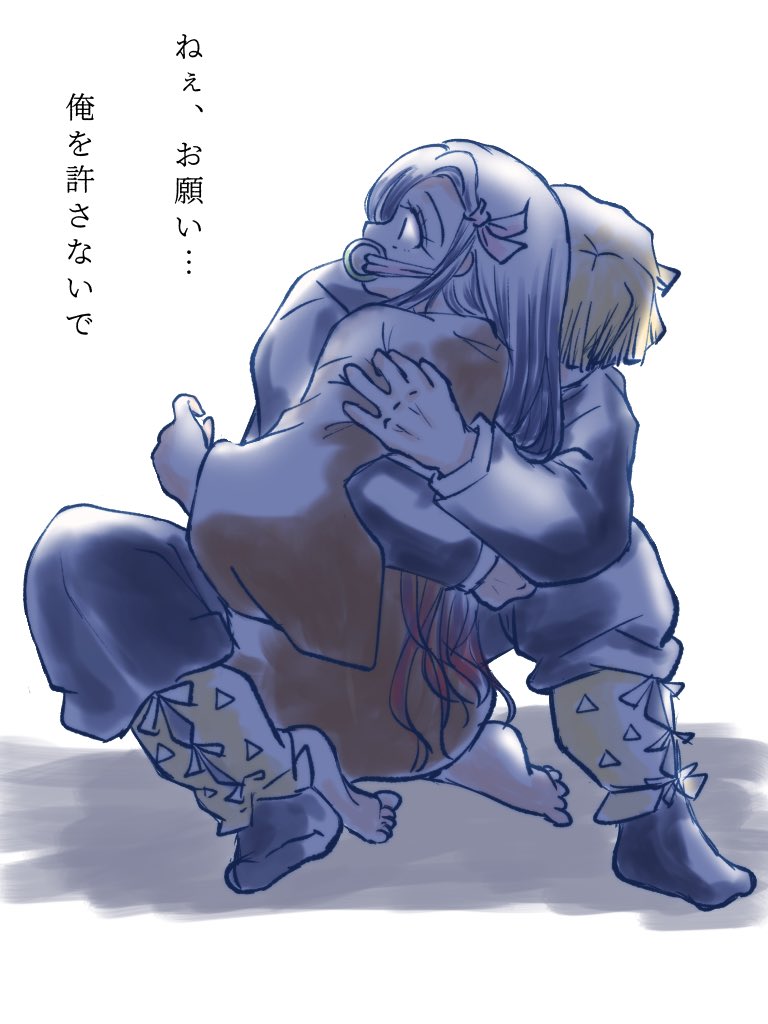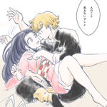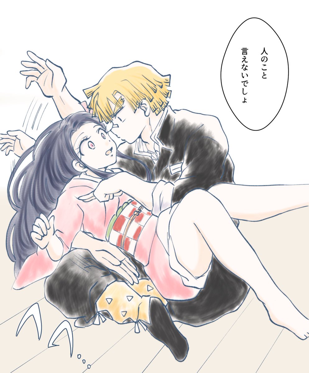 #ぜんねず版深夜のお絵描き60分一本勝負 第74回 お題【添い寝】 主催様いつもありがとうございます。 何万番煎じだとは思いつつ… 遊びに来たけど⚡️は任務帰りで仮眠中で、試しにひっついたらあったかくてそのまま寝ちゃった鬼🎀ちゃんと、目が覚めたけど状況が状況で起きられなくなった⚡️