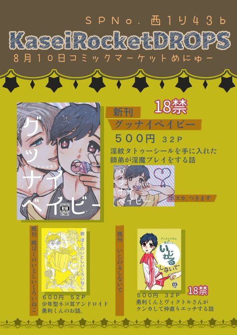 お品書き作った。 結局また時間なくておまけはポスカですけど微妙に時間があったのでいつもと違う印刷屋さんにお願いしました。 あと枠外がめっちゃうるさいペーパー作ったんでそれもつきます。 よろしくお願いします。