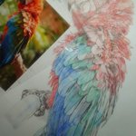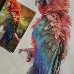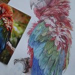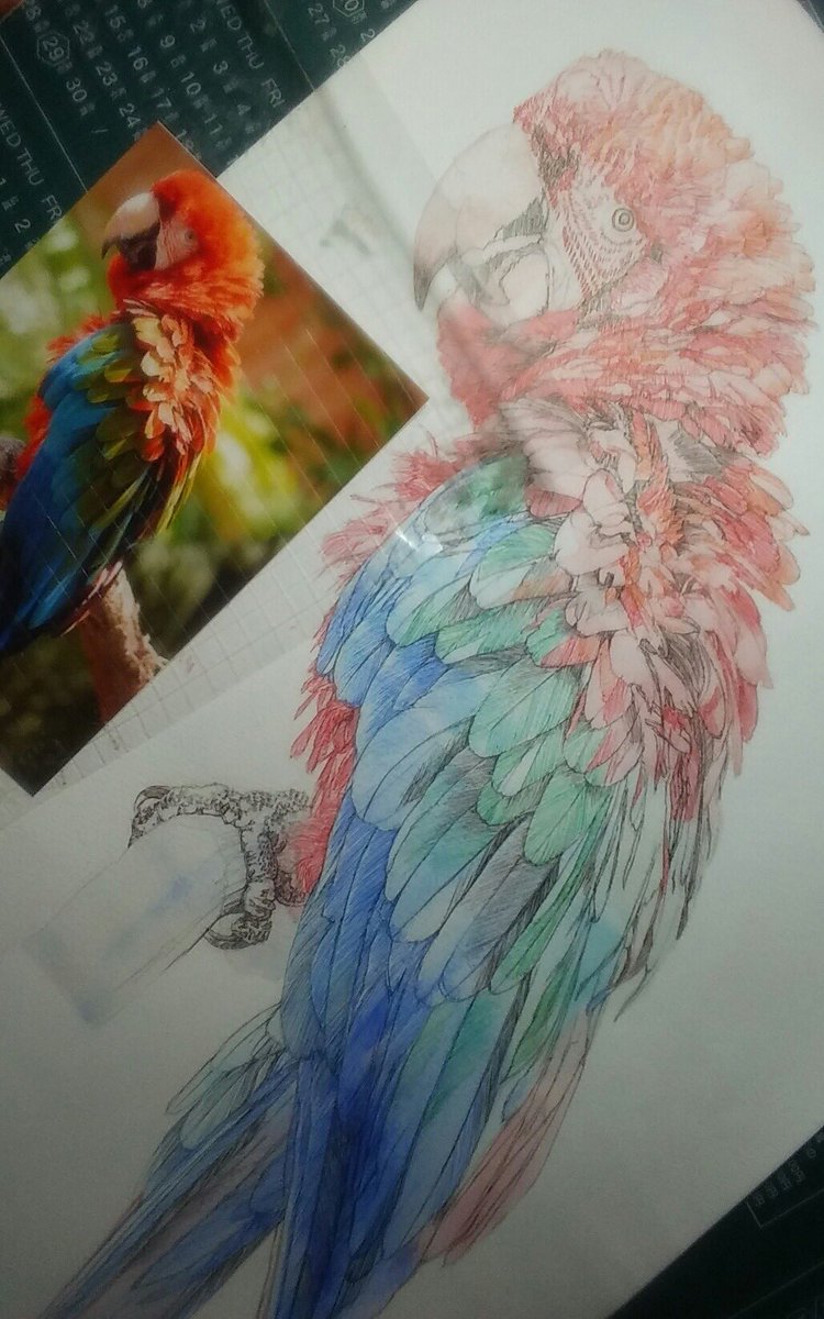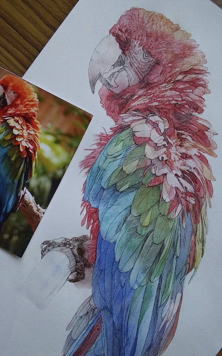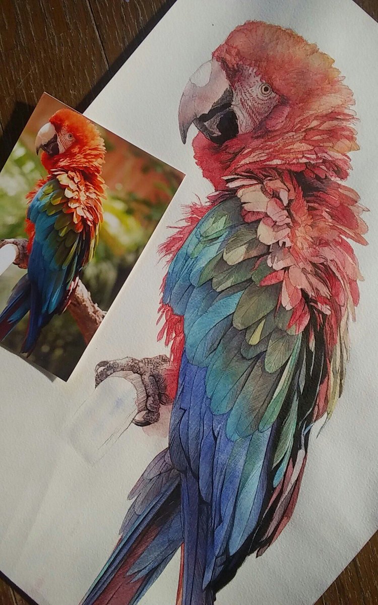 戦争、疫病、飢餓、異常気象で、世界が破滅に向かう中、お絵描きと恐竜模型作りに勤しんでいます。 他にやることがないしね。 (8/4頃) #水彩画 #不透明水彩 #鳥 #ベニコンゴウインコ #イラストメイキング