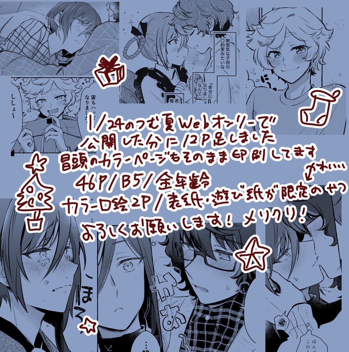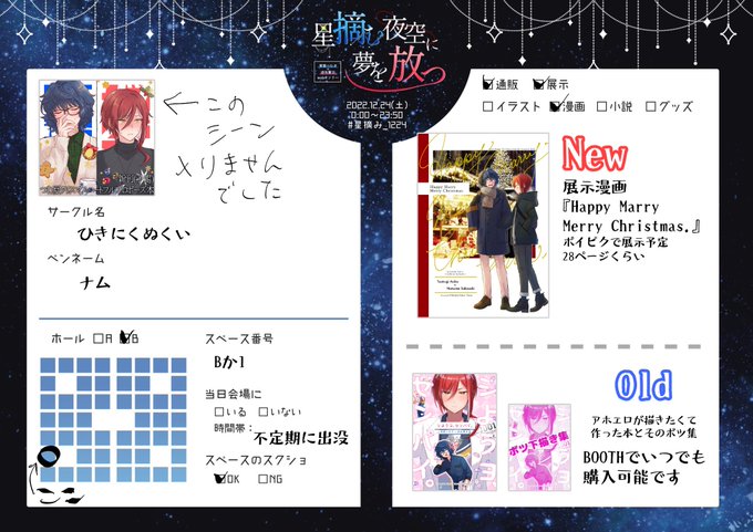16 52 #星摘み_1224 明日のつむ夏webオンリー参加します‼️ クリスマスに合わせて漫画描きました‼️ 多分天祥院英智のアバターで参加します(これから作る) よろしくお願いします‼️‼️ Bホール か1 ひきにくぬくい 22/12/23 11:14