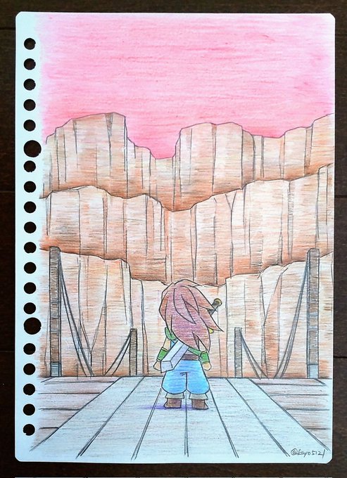 #聖剣3ワンドロワンライ お題「草原の国フォルセナ」「敵」「空」で旅立ちのデュランを描きました。+50分ぐらいです。 ToMのデュランOPで大地の裂け目を通ったのがたまたま夕方で、打倒紅蓮を誓うデュランの視線の先の、紅蓮を思わせるような赤い空が強く印象に残ったのでこのシーンを描きました。