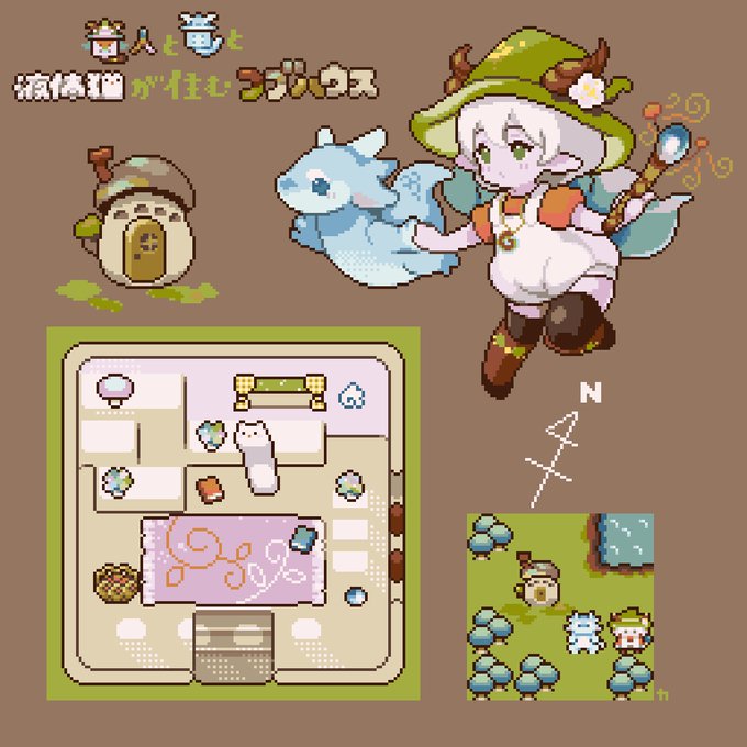 竜人と竜と液体猫が住むコブハウス #ドット絵 #pixelart