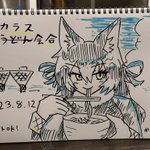 13 34 会場の蛍光ペンをお借りして、即席で描かせていただきましたうどんウルフ。絵を見て喜んでもらえる場所って、コミケ以外にもこんなところにあったんですね。 #カラス会合 23/08/12 22:13