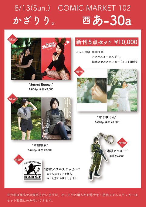 【お知らせ】 大変お待たせいたしました! 8月13日(日) 西あ-30a かざりり。 コミケお品書きです✨ 今回は新刊3冊&アクキー&メタルステッカーのセットです!写真集はかなり分厚く仕上がりました😊 後日サンプルアップします!頑張って作ったので、ぜひお手に取っていただけたら嬉しいです📕… twitter.com/i/web/status/1…