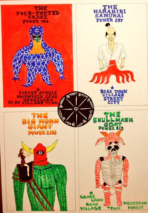 四面シリーズ095 四足歩行ヘビ ハラキリ侍 大きな角の巨人 スカルマスクのヤギ #イラスト #イラストレーター #ポップアート #ゆるキャラ #モンスター #illustration #popart
