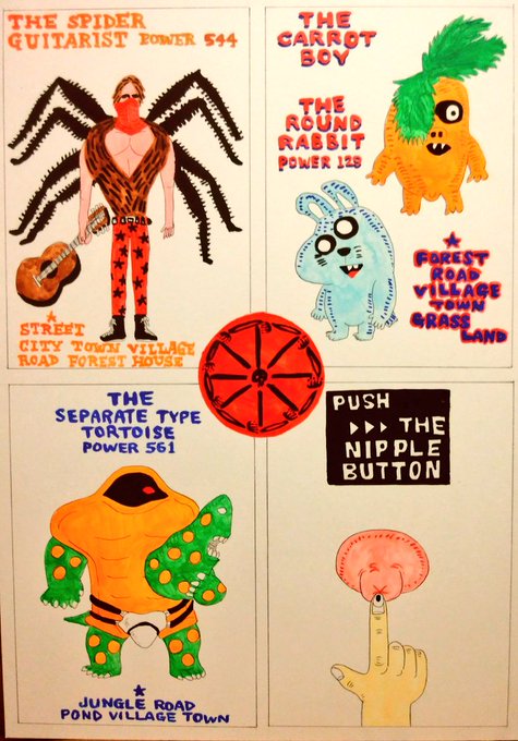 1 39 四面シリーズ098 ギター蜘蛛男 人参ボーイと丸ウサギ 分離カメ 乳首ボタン #イラスト #イラストレーター #ポップアート #ゆるキャラ #モンスター #illustration #popart 23/04/19 20:20