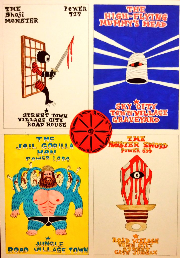 1 13 四面シリーズ104 障子モンスター 飛ぶミイラ男の頭 監獄ゴリラ男と捕らわれの人たち 巨大ソードの怪物 #イラスト #イラストレーター #ポップアート #ゆるキャラ #モンスター #illustration #popart 23/06/09 18:59