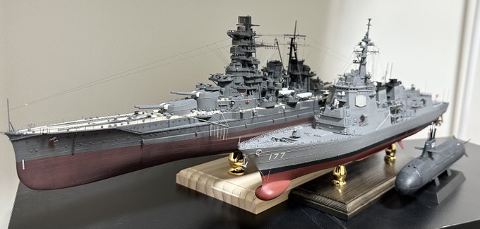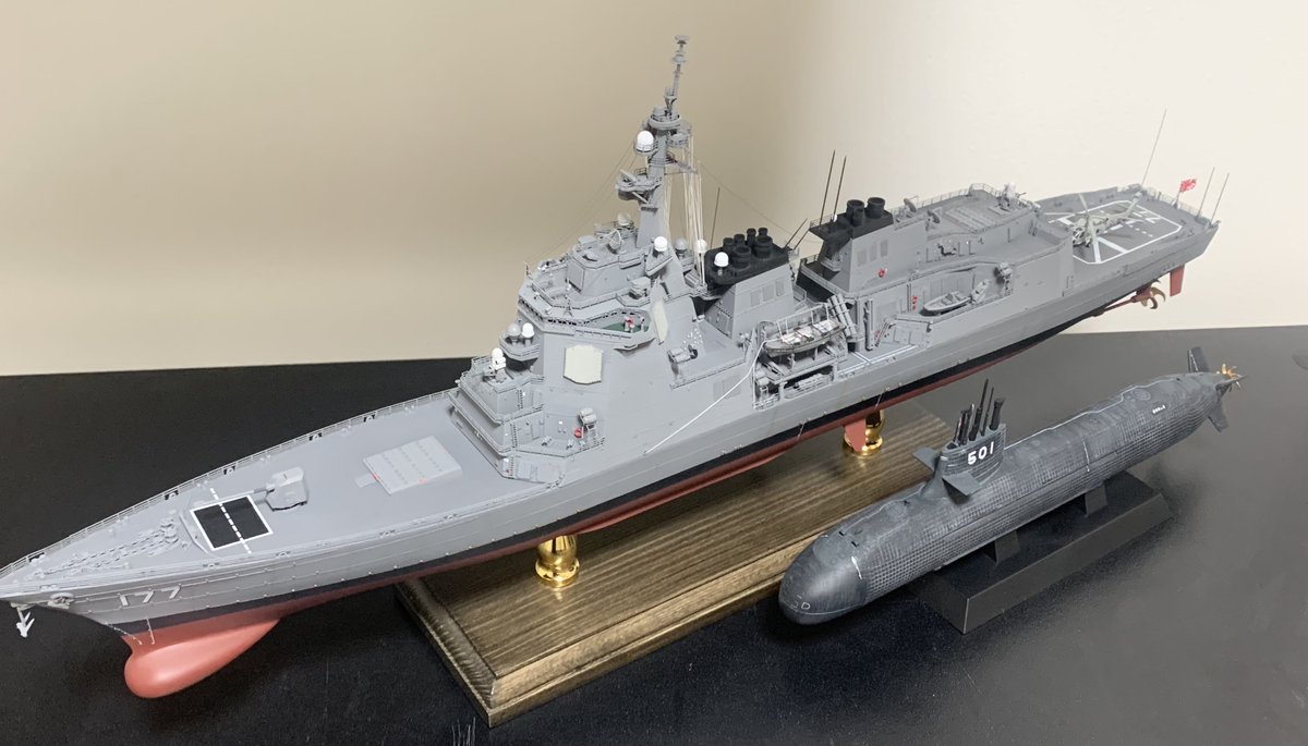 #今年作ったプラモ晒そうぜ アメパラプラコンで大賞頂いたバゲ(死ぬほど嬉しかった) 1/350 護衛艦あたご そうりゅう (甲板のパネルラインをスジ彫りしてみた) 1/350 戦艦金剛 (今までの模型人生で1番頑張ったやつ。来年は自己ベストを越えていく)