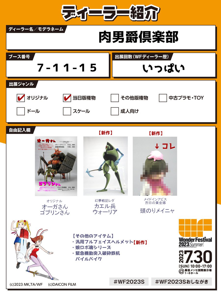 ワンフェス2023冬、肉男爵倶楽部は6-15-04。 ボク製作のアイテムは以下4点。 ・マアアさん(メイドインアビス) ・ゾッド・クシャーン戦ver(ベルセルク) ・ゴブリンさん ・オーガさん fleischbaronclub.jp #WF2023W #ワンフェス2023冬