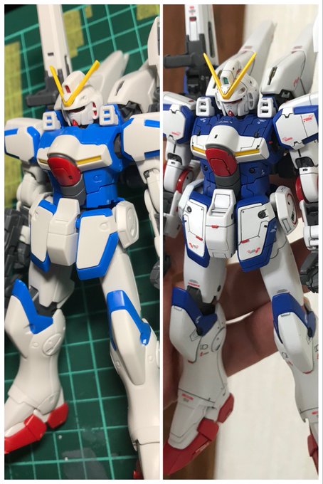 セカンドV進捗状況。まだ完成していませんが素組み写真と比較してみました。照明の当たり方も違いますが、かなり変わったのではないでしょうか。水曜日には完成できそうです。#ガンプラ #ガンダム #ガンプラ好きな人と繋がりたい