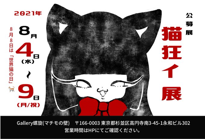 8月4日~9日はgallery螺旋(マチモの壁)にて猫狂イ展がありますよ~!出展者大募集中です!猫好きさんどうぞよろしくお願いいたします😸8日は世界猫の日🐱 #世界猫の日 #公募展 #絵描きさんと繫がりたい #猫好きさんと繋がりたい