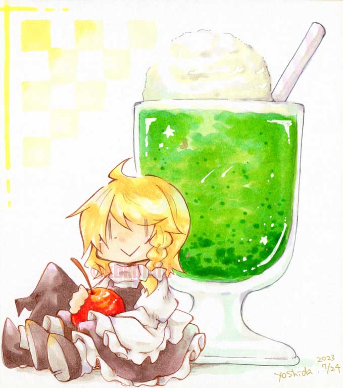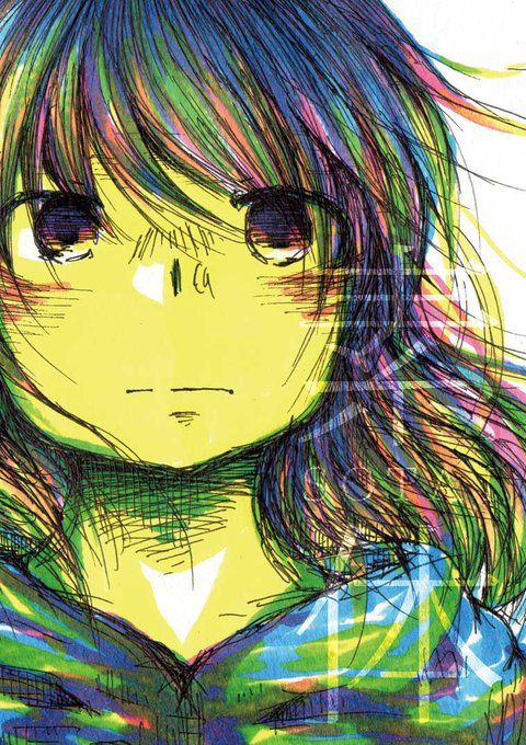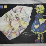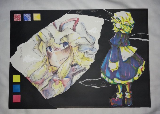 参加して描いてきたのはコチラ。テーマは【丸】キャラは【紫】でした。丸→環のイメージで3色色縛りを水彩色鉛筆とコピックで。紫とメリーの関係性と。ちぎった紙を円形を。紙はわからなくなっちゃったなぁ。ありがとうございました! #PAINTERSHIGH22