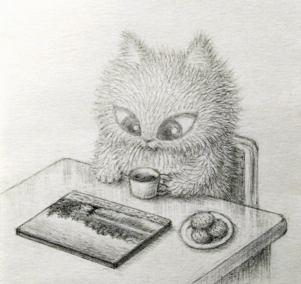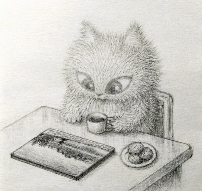 【新作をふりかえる猫】 今回のけい吉は、新作を、くつろぎながら振り返っています☕ 「この瞬間がサイコーなんだにゃ♪」 片手には、タンポポ珈琲。皿の上には、大好物のヨモギ餅(共に解毒効果大)。けい吉は、健康志向な猫なのです。 #鉛筆画 #イラスト #cat #catart #illustration #pencildrawing