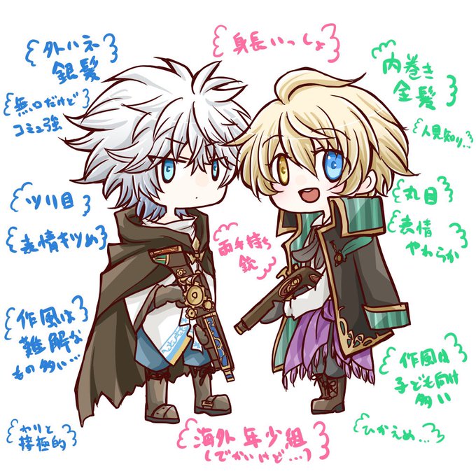 20 77 ランキャロちゃんの、ちょいちょい共通してる部分を押さえつついろいろ対象的なところが悪の華イベの時から好きなので、身長情報が大変おいしかったというらくがき……双子コーデとかやってくれ…… 22/10/02 14:51