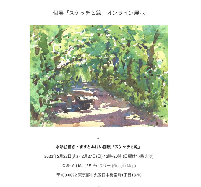 [展示のお知らせです。] 水彩絵描き・ますとみけい個展「スケッチと絵」 2022年2月22日(火)-27日(日) 12時-20時 最終日17時まで 会場: Art Mall 東京都中央区日本橋室町1-13-10 *開催概要が変更となる場合がございます。ご来場前にWebサイトをご確認ください。artmall.tokyo