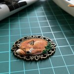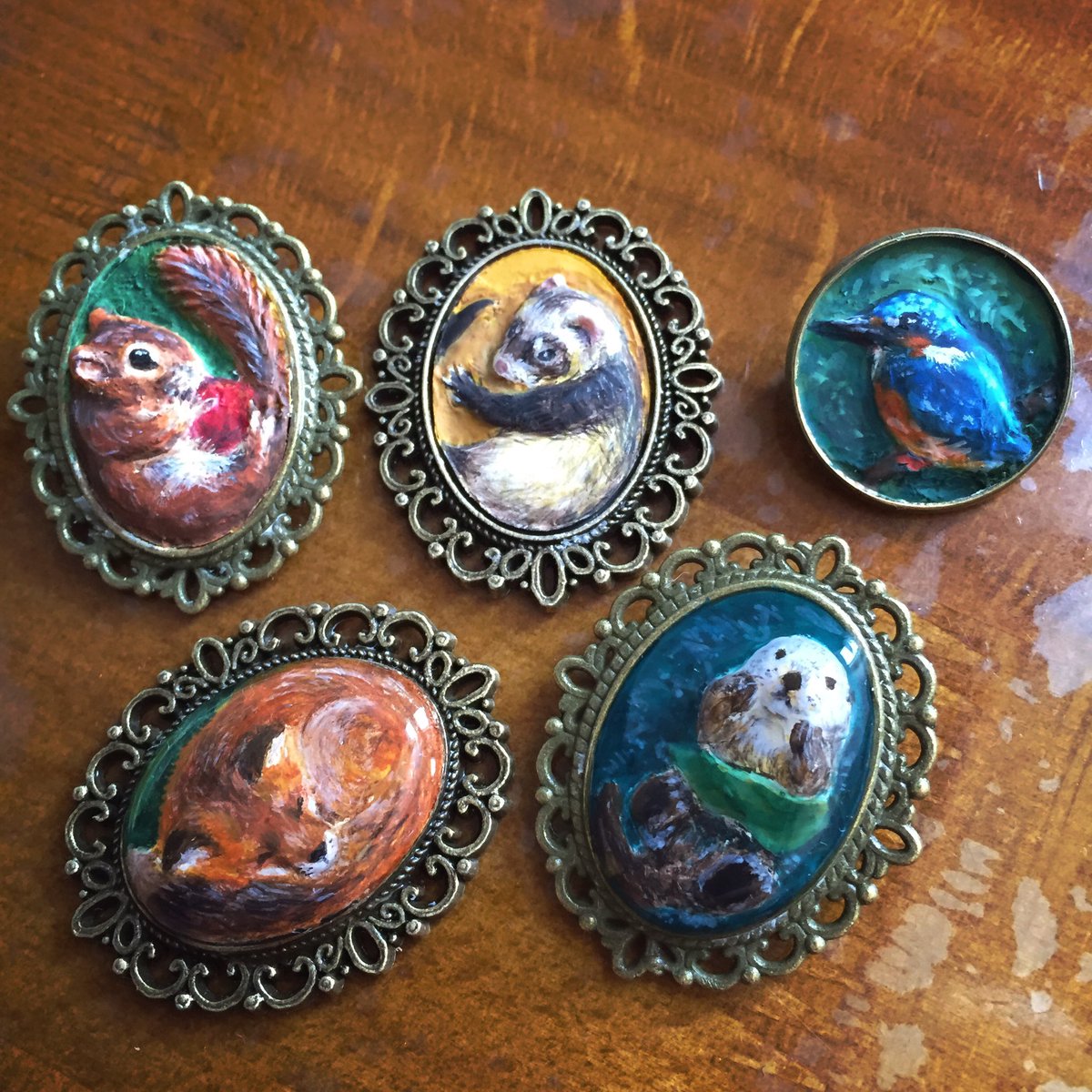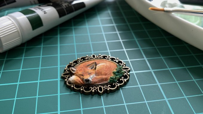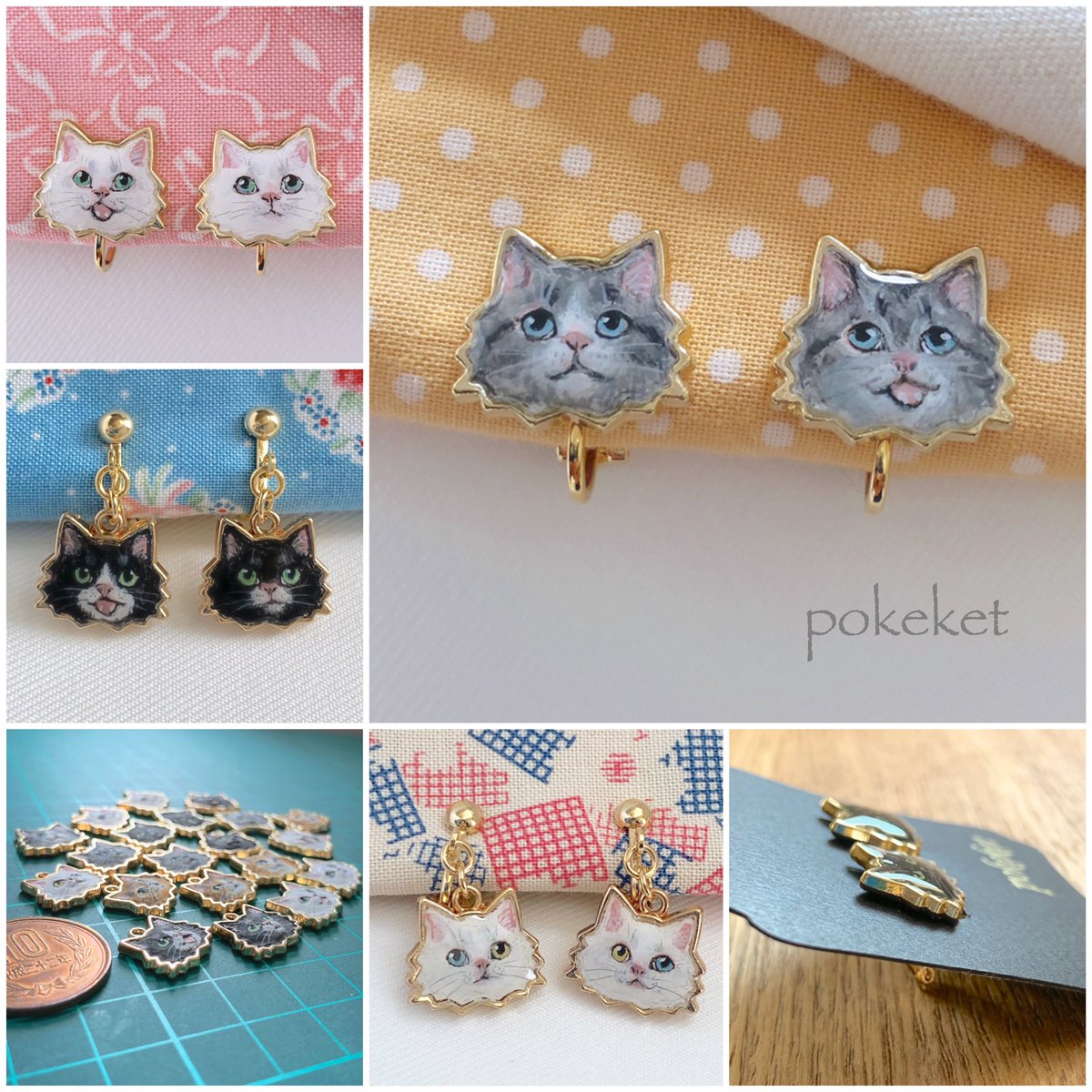 #ツイッター創作発表展 タグお借りします🍀 セッティング台に樹脂粘土で一つひとつ形を作り、 そこにていねいに絵を描きレジンコーティングをしたアクセサリーなどを作っています。 時々脱線して違うものも作ります。