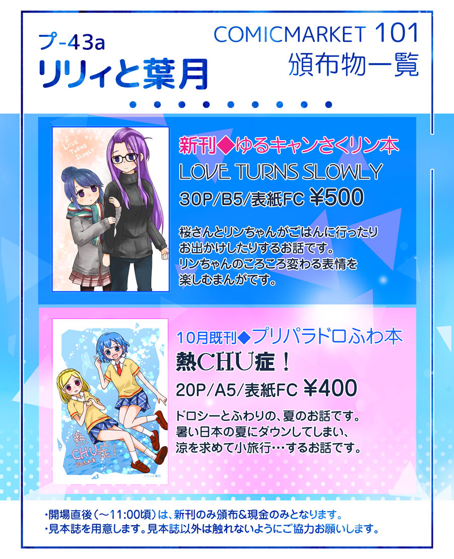 【 #C100 】コミケ1日目東パ-45b「リリィと葉月」にてドロふわ本を頒布します!コミケwebカタログもご覧ください~ webcatalog.circle.ms/Perma/Circle/1… #C100WebCatalog