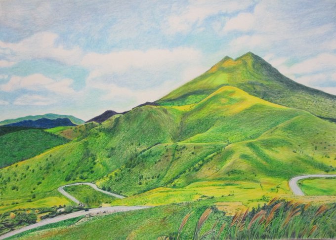 1 5 大分県由布岳です。 野焼きをしてるせいか、大きな木がありません。 #風景画 #色鉛筆画 22/08/22 23:37