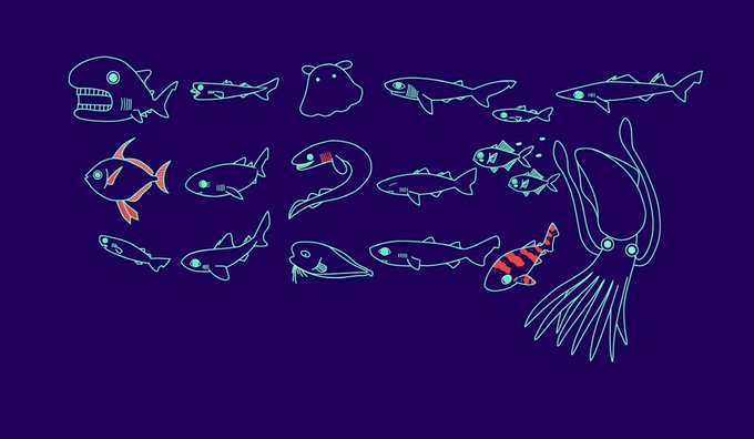 今回作った深海ザメポーチの生き物たち一覧です🦈🦈🦈名古屋クリエイターズマーケットで販売しますー。 #サメ #イラスト #shark #illustration #クリエイターズマーケット #クリマ48