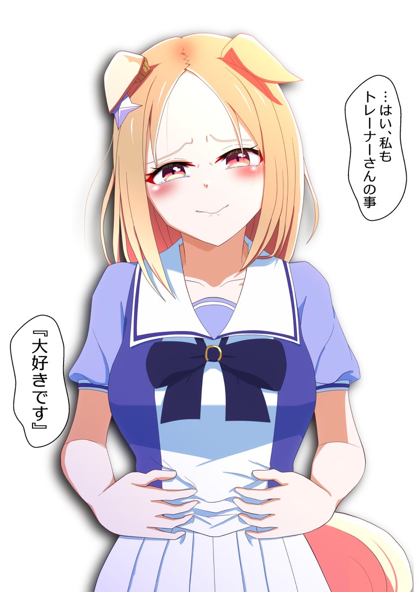 「私のことどう思っていますか?」と聞かれ、諦めず前向きで苦しい時でも人一倍努力してみんなに笑顔をくれる姿を思い浮かべ、最高のウマ娘だと思い「大好きだよ」と伝えると「はい私もトレーナーさんのこと大好きです」と制服を握るように手汗を拭きながらさみしそうに笑うナリタトップロード #ウマ娘