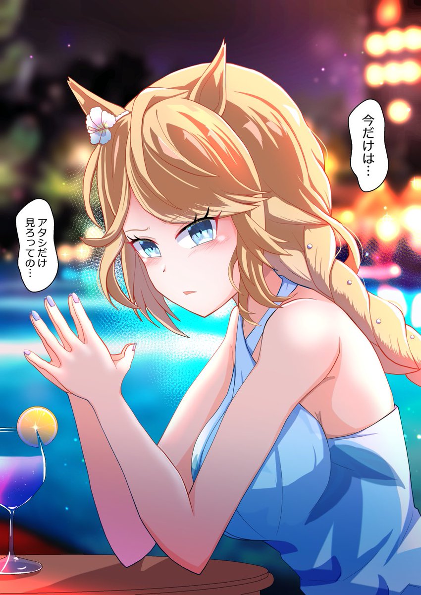 44 263 サマーウォーク中「アタシも付いてく」と言うので一緒に見回りしていると他の娘達に「トレーナーさんかっこいい」と言われる。ナイトプールでくつろいでいる時、午前中のことを思い出していると「なにニヤついてんの」と不機嫌そうに睨みつけてくるワンピースドレス姿のゴールドシチー #ウマ娘 23/07/09 19:00