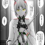 一緒にヴァイオリンを弾いた後、自分が持っている弓の毛が数本切れているのを見つけ落ち込む。「弓毛は消耗品だから気にしないで。張り替えるからしばらくこっち使ってて」と言って持っていた弓をこちらに渡してくるファインモーション。 「…私ね今とっても嬉しいんだ♪」 #ウマ娘