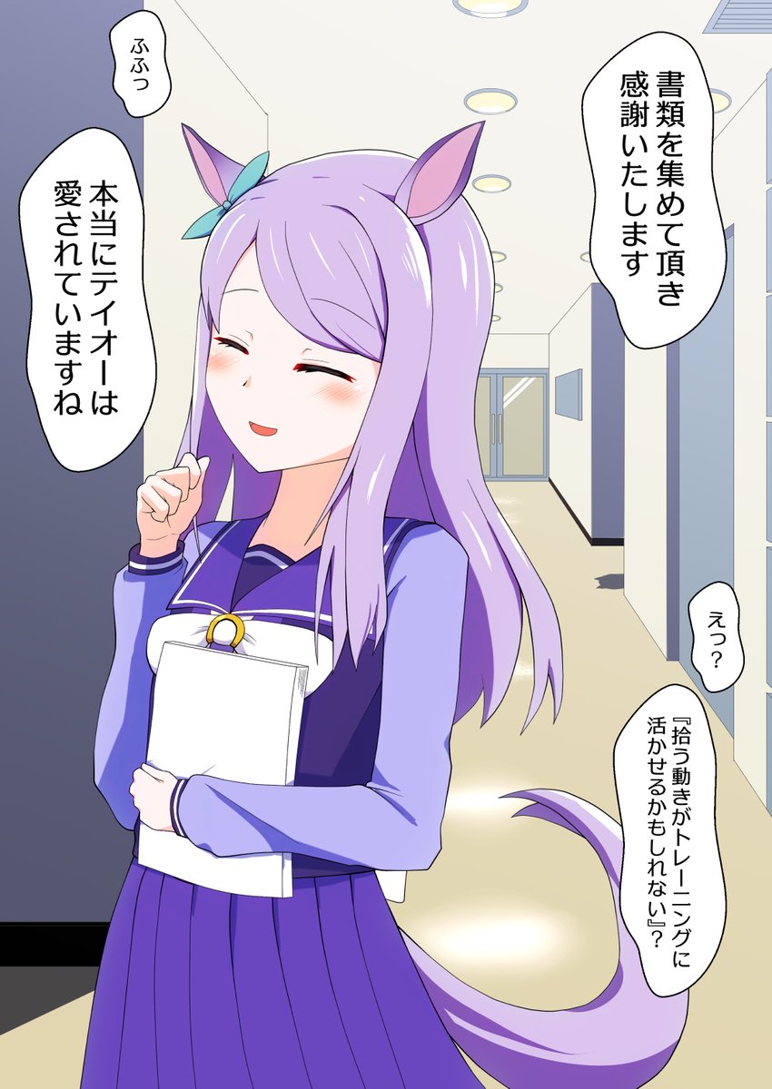 トウカイテイオーとの練習に向かう途中、廊下の曲がり角でメジロマックイーンと衝突してしまう。その拍子に彼女が持っていた書類が散乱してしまったため一緒に拾う。その時の動きがトレーニングに活かせそうだと伝えると「本当にテイオーは愛されていますね」と彼女は微笑んだ。 #ウマ娘
