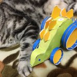 5歳の娘と共同制作したペーパークラフトの、プルバックで走るステゴサウルス。 銀八に背びれを取られました。 #ペーパークラフト #キャノン