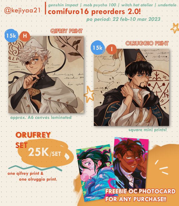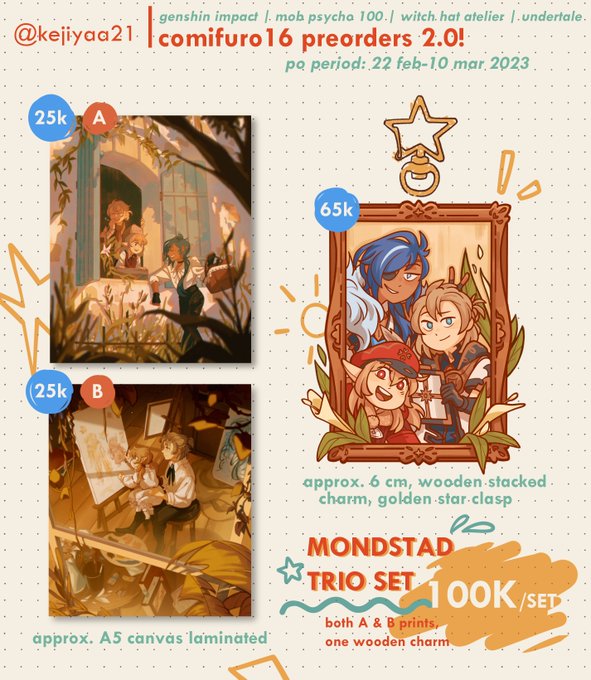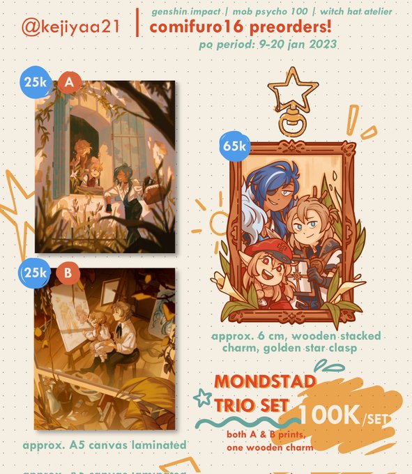 [RTs are appriciated!] (1/3) Hi hi! I've opened up the Pre-Orders of my merch for #Comifuro16! I will be there both days! (Table number yet to be announced) 🧡PO Period: 9th January - 20th January 2023 #comifuro16 #cf16 #artidn #genshinimpact #mobpsycho100 #witchhatatelier