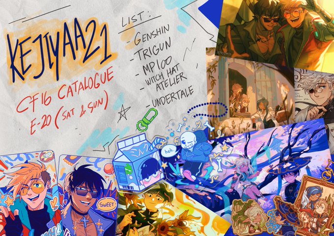 [RTs & likes are appriciated!] (1/7) Hi hi! Here's my full catalogue for #Comifuro16! ⭐️Table E-20 (ab) both days! ⭐️ PO link: forms.gle/SAwXCQU12jRwS3… -- #comifuro16 #cf16 #artidn #genshinimpact #mobpsycho100 #witchhatatelier #TRIGUN #TRIGUNSTAMPEDE #undertale
