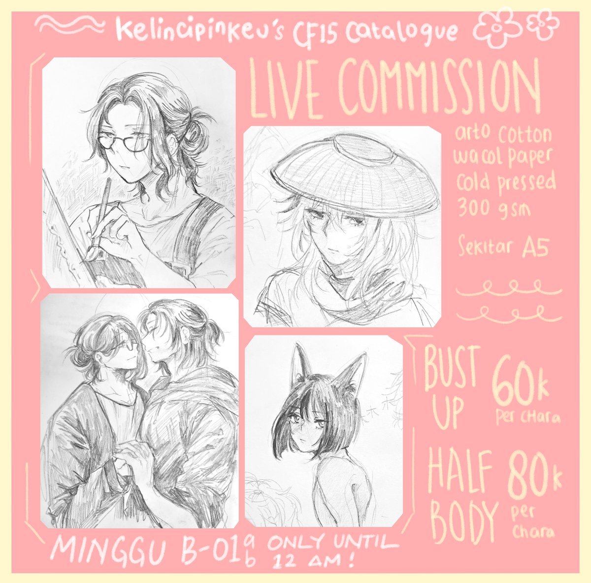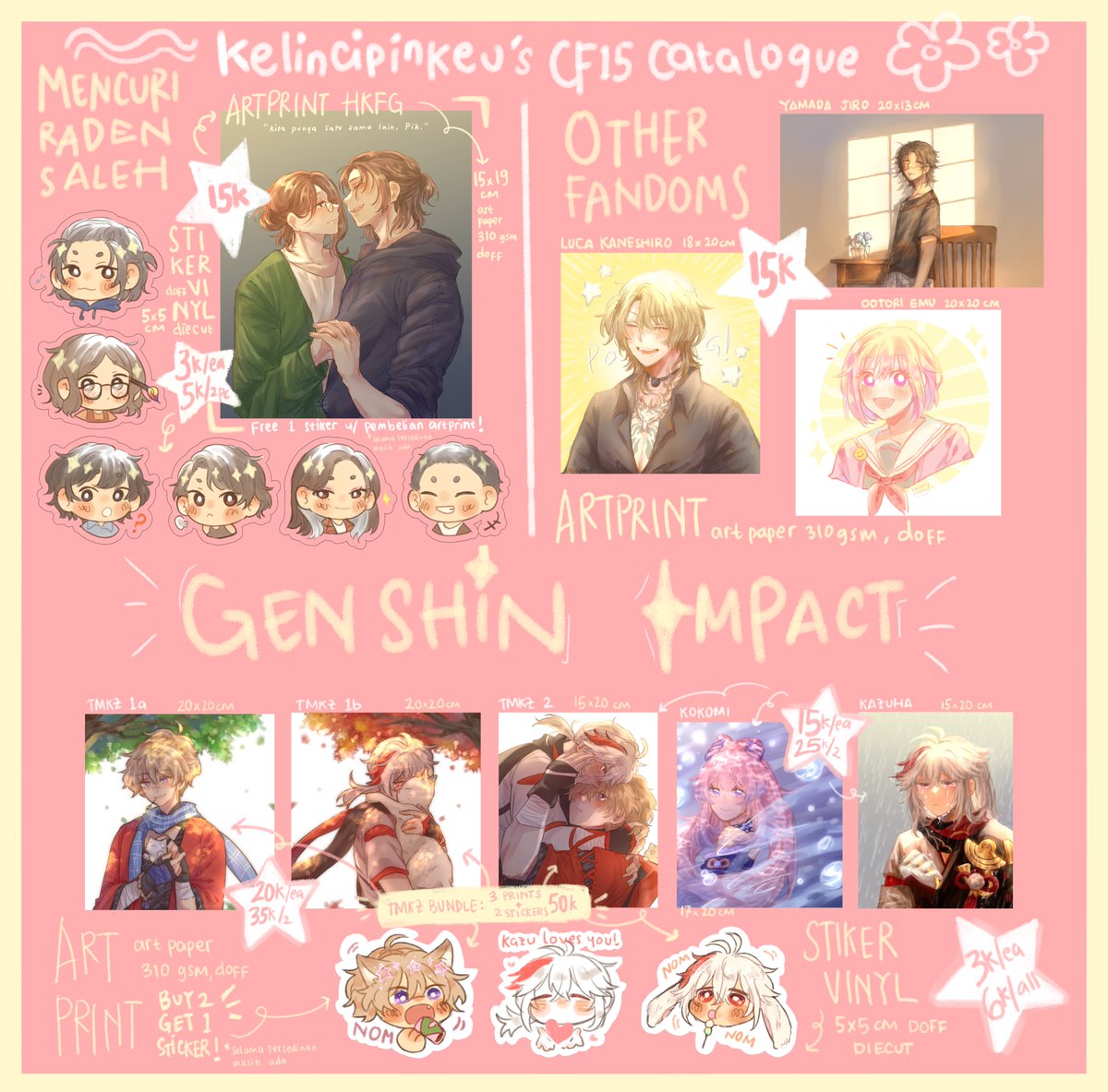 [RT & shares are appreciated!] i will be selling these items at CF15 booth B-01 sunday only! untuk stiker bisa juga ditrade dengan merch atau makanan / snack :D dan khusus untuk live comms cuma sampai sekitar jam 12an atau kurang so grab it fast! >__< #CF15Catalogue
