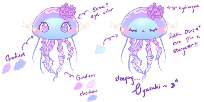 Not sure how to design a mascot… Just imagine a cute jellyfish decorated with hydrangea, floating joyfully around Uki🔮💜 (Details in below I tried🤣 hope you all like it~ #VioletAtelier #UkiMascot