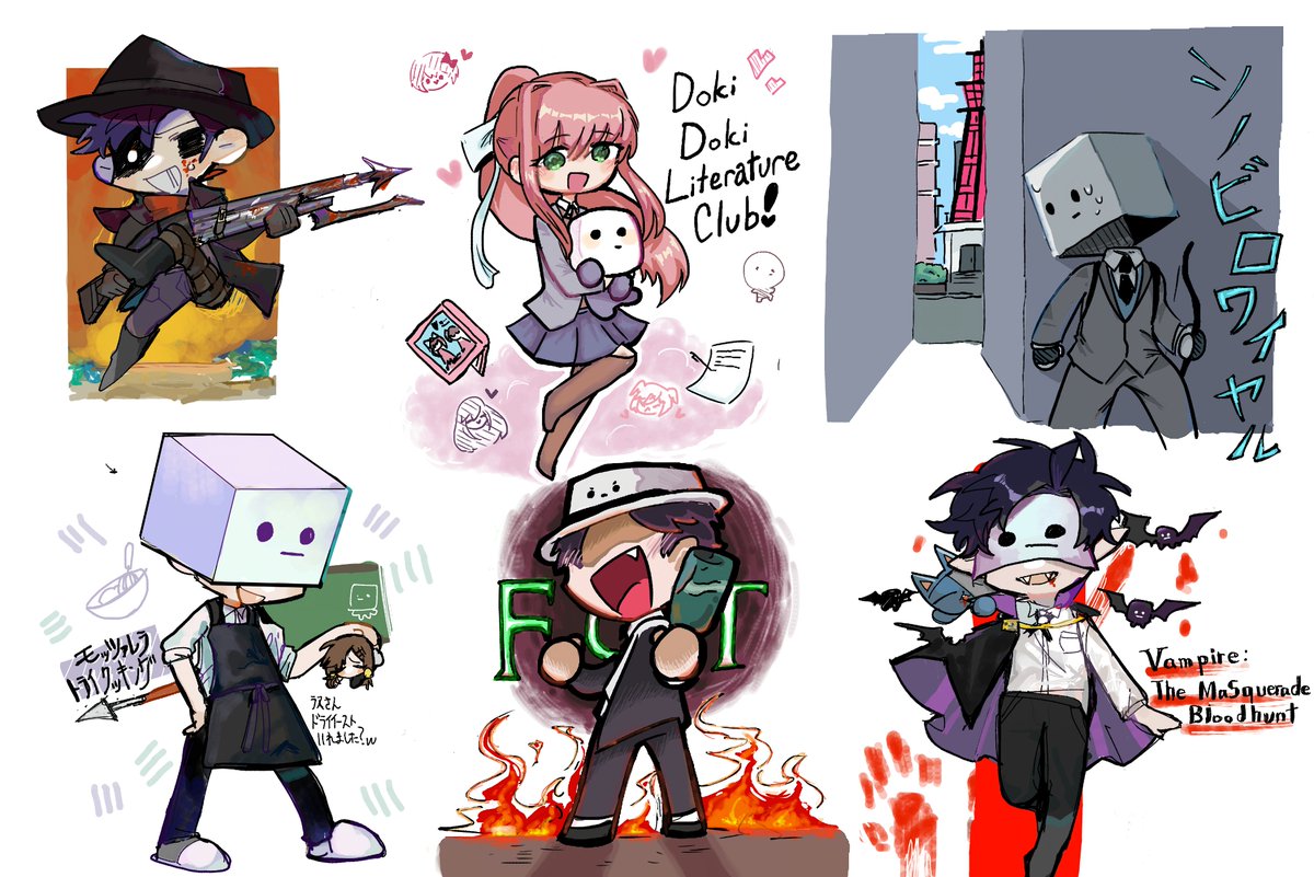 さかさん( @ sakekasu12 )とへくさん合作絵茶をしました!!うおお さかさんが描いた絵:DbD、モッツァレラチーズクッキング、Vampire ケムボが描いた絵:DDLC、FCT、シノビロワイヤル 自分が描いた単体絵はリプ欄に載せて、さかさんが描いた単体絵はリツイートしときます!ぐっ! #絵くしょん