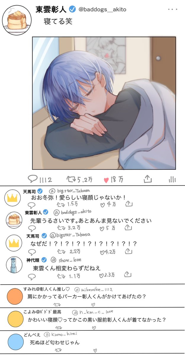 506 4211 同クラなのにお互いの存在すら知らないレベルだった彰冬が同じチームになったのをきっかけに相棒になっていく話吸いたい 22/08/03 20:43