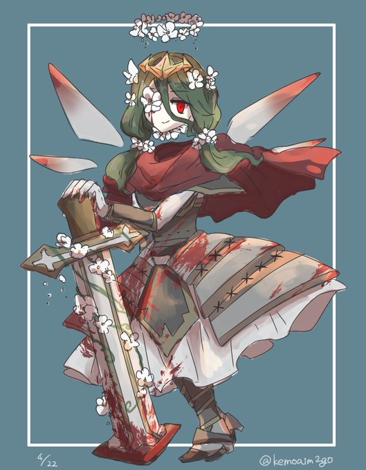19 77 #人外版深夜の真剣お絵描き60分一本勝負 「アナタが考える花冠をつけた人外」「デュラハン」から! お花大好き首無し騎士ちゃん⚜ 22/04/23 00:28