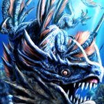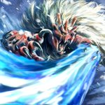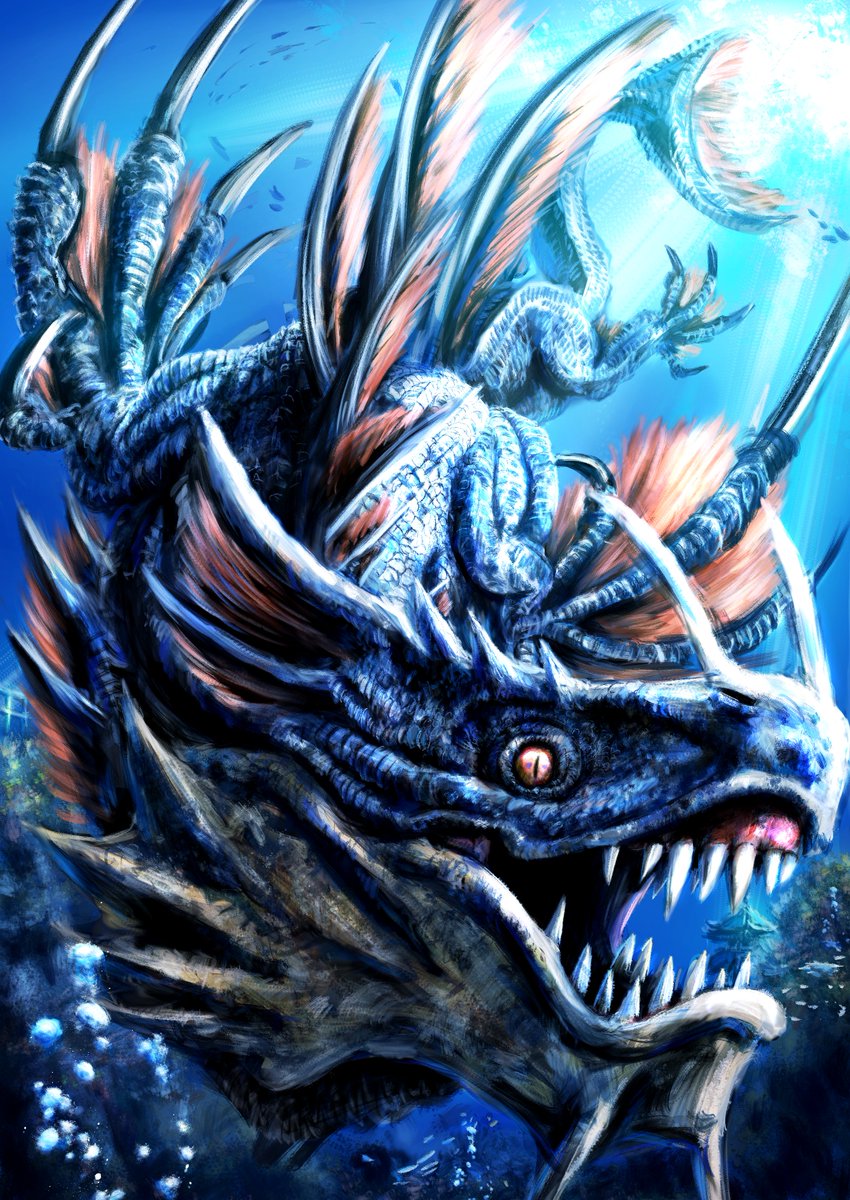 海の守護神 (おおうみ) 大海怪龍 オロチウオ 大海に生息する龍。大きな体躯と強力な顎を持ち、広大な海を優雅に泳ぐ 縄張り意識が強いためか、異国の侵略船を壊滅に追い込んだことがあり、現地住民から守護神と崇められている #怪獣 #絵描きさんと繋がりたい #イラスト
