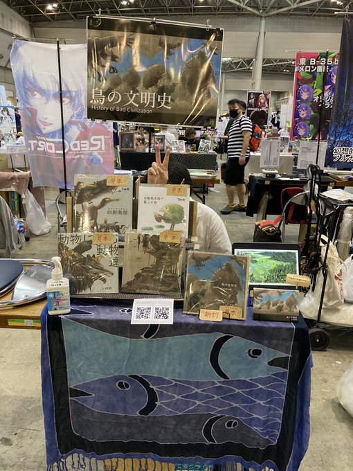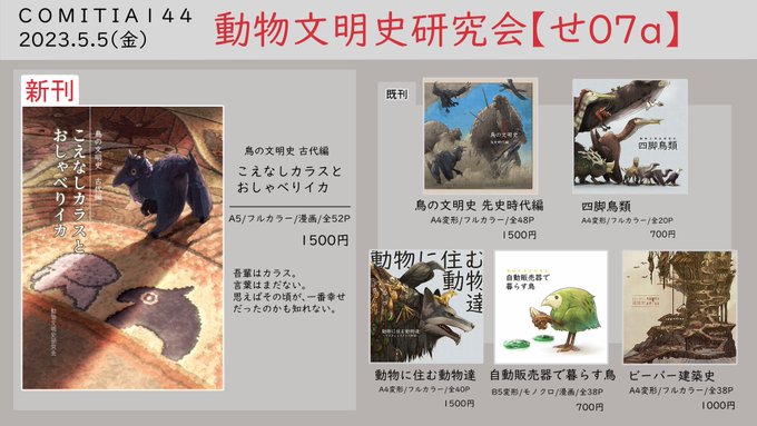【お品書き】 明日開催の #COMITIA141 に C100で頒布した「鳥の文明史」(コミティアでは初頒布なので新刊枠にしております) 他既刊4冊持っていきます!宜しくお願い致します。 サンプルは引用RTからどうぞ↓ twitter.com/kemyth111/stat…
