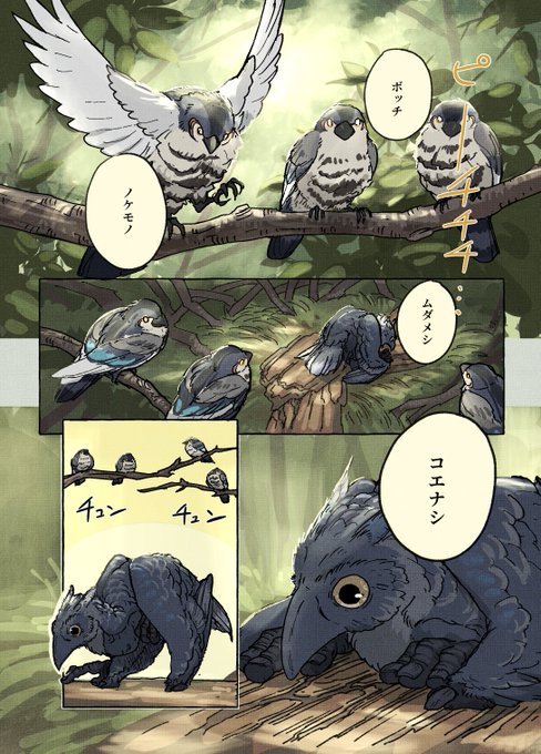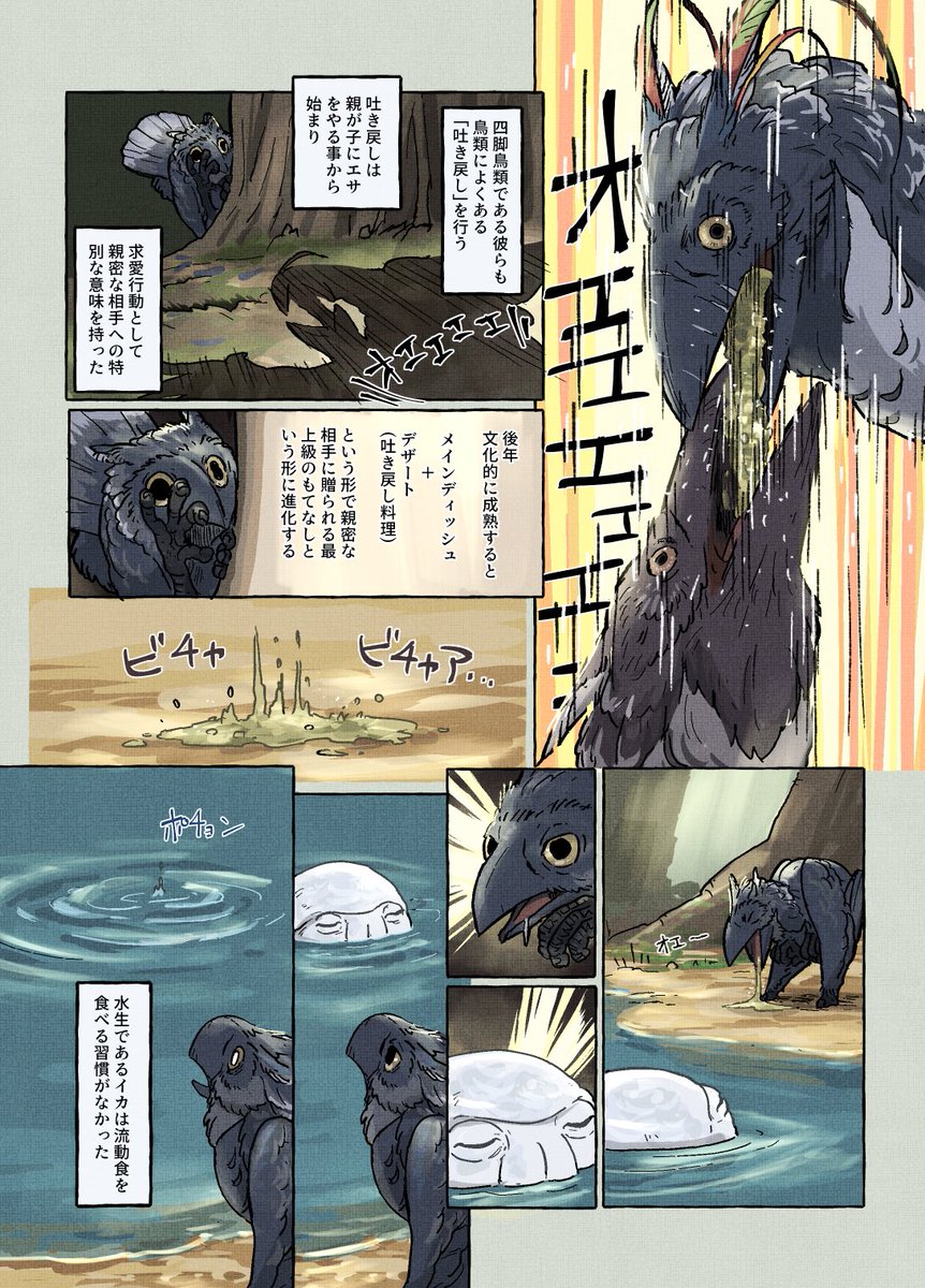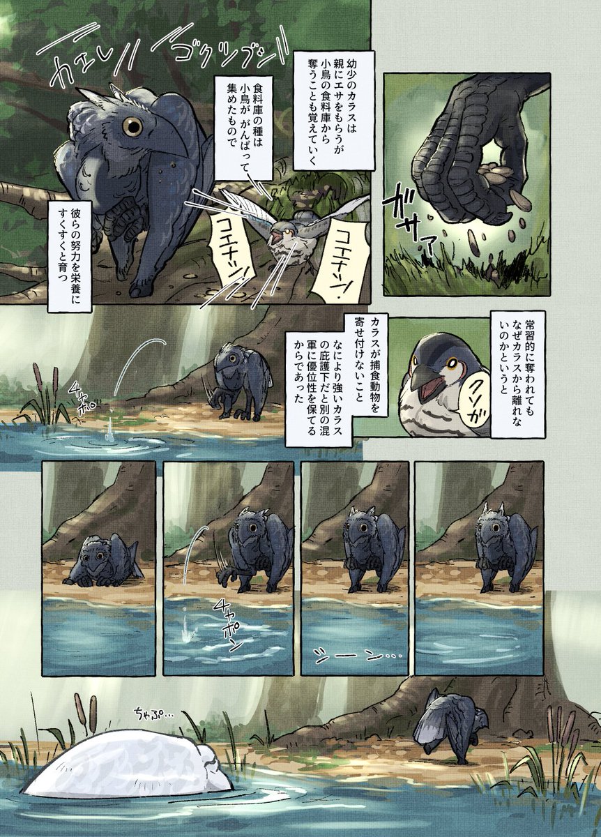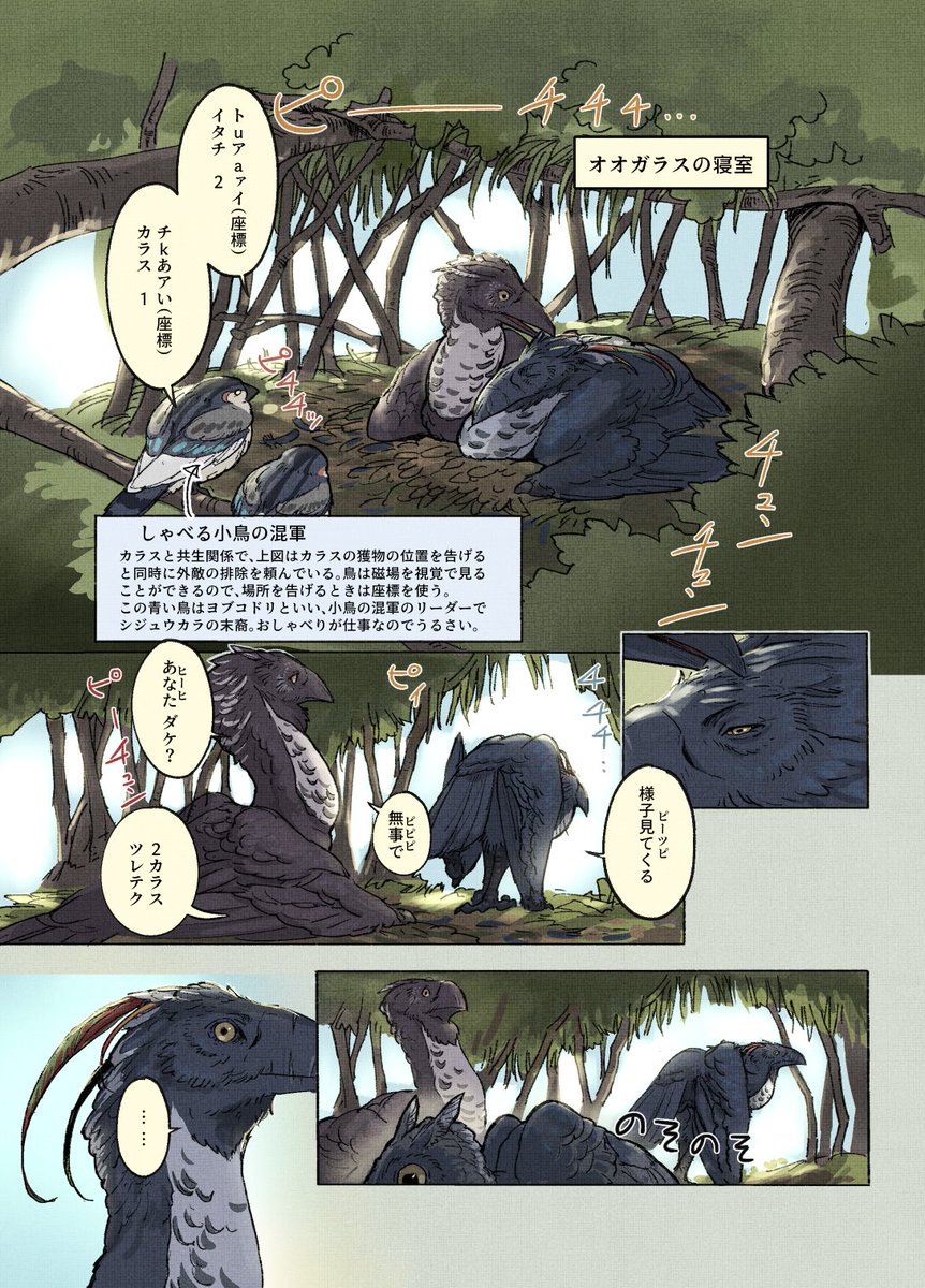 コミティア144に持っていく予定の新刊冒頭のサンプルです(まだ脱稿してません…) 【鳥の文明史 -こえなしカラスとおしゃべりイカ-】 (1/2) #COMITIA144 #漫画が読めるハッシュタグ #動物文明史記