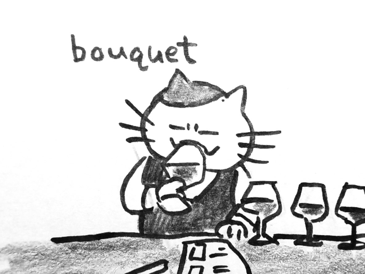 ワインの香りを由来別に分けると、果実、発酵、熟成の3種類あるのだと聞きました。なるほど、分解して感じればあるいは!と思って嗅いでみたんですが………うーむ。もっともっと呑む必要がありそうです。 #inktober #inktober2022 #bouquet