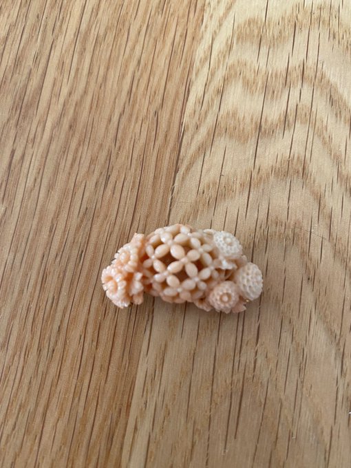 26 233 珊瑚の帯留の世界展で展示する作品のリストを作ってます。この人差し指の第一関節ぐらいの菊の帯留、少し降ると中にある球ごコロコロと鳴ります。外から少しづつ球を削り出したんですね。 #珊瑚 #coral #サンゴ #帯留 #着物 22/01/28 15:45