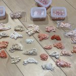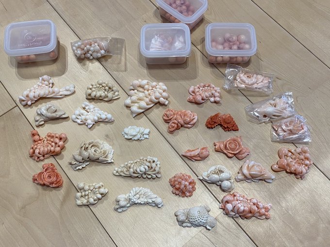 359 2194 珊瑚の玉が必要になり、実家から商品を入れているケースを持ってくる。中から取り出していると、父が何十年も前に作った珊瑚の花が結構出てきた!しかもケースに入れて整理してたのは20代の僕なのに忘れてる💦 #珊瑚 #サンゴ #coral 22/03/31 09:35