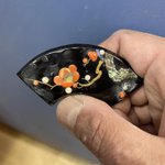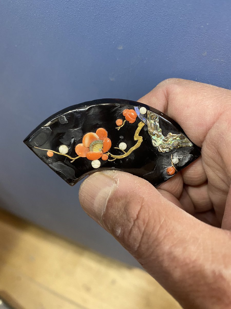 20 138 虫喰い状態の鼈甲帯留を入手。鼈甲屋さんのブログを見ていると「そのまま放置すると、どんどんバクテリアに侵食されるので樹脂でコーティングした方が良い」と書いてあり仕事の合間に虫喰い箇所に樹脂を塗り磨いてます。何回か塗ってフラットにして綺麗にしていく予定。修理の練習も兼ねてます 22/04/06 12:45
