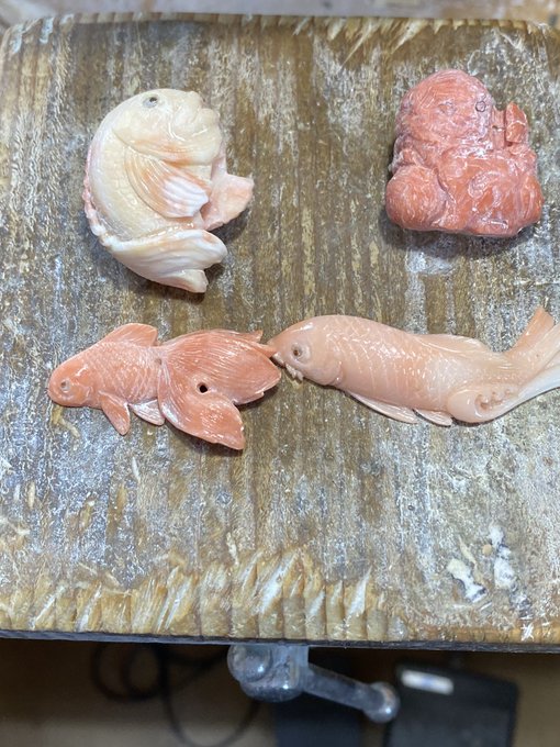 28 217 桜鯛の帯留、金魚、鯉に目を水牛角と白蝶貝を嵌め込み(金魚と鯉は父が作ったもの) 。先日、宿毛へ行った時に吉良珊瑚店さんの店頭にあった"獅子と蝶"の帯留が欲しかったのですが資金が足りないので桃珊瑚で自作してます😅#珊瑚 #coral #サンゴ #帯留 #着物 22/04/13 09:44