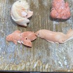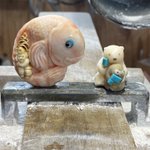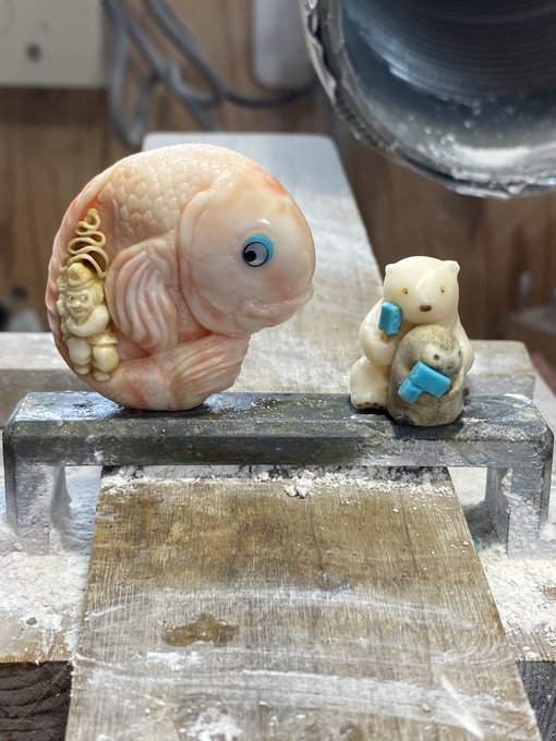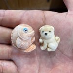 28 195 北極鯨とベルツノガエルの根付を磨きました。北極鯨は紐穴の近くが虹色になっていて綺麗です☺️ #珊瑚 #coral #サンゴ #海松 #根付 22/05/23 14:59