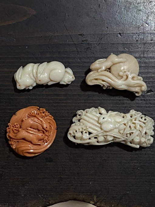 先日、制作した白蝶貝の白鳥帯留の為の材料取りで余った端材でウサギ帯留を作る。目は水牛角と猪牙。 #白蝶貝 #帯留 #着物