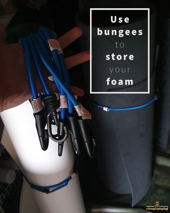 Have lots of loose rolls? Use bungees to roll your foam up to save space! #DumbTipIsDumbButIGuessItsUseful #JustKennysTip #foamtips #foamarmour #cosplay #cosplaytips #foamsmith
