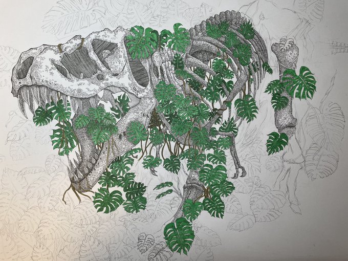 完成しました、、。 作品名『 monster 』 #絵描きさんと繫がりたい #恐竜 #モンステラ #ペン画 #コピック