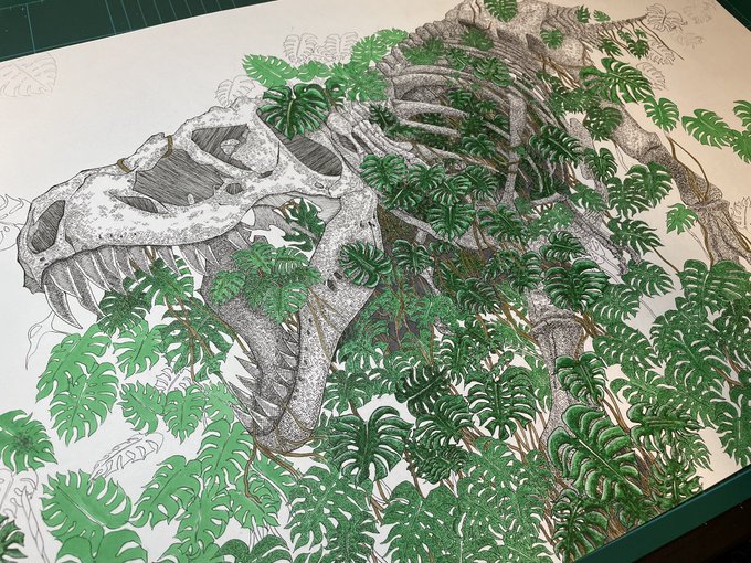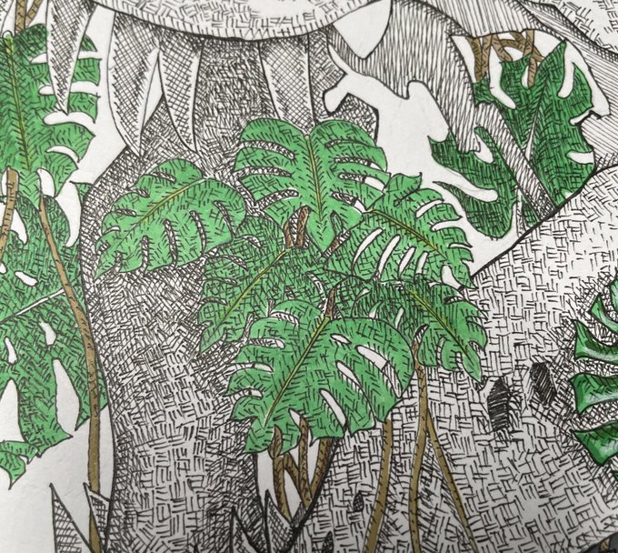7 97 完成しました、、。 作品名『 monster 』 #絵描きさんと繫がりたい #恐竜 #モンステラ #ペン画 #コピック 21/11/04 21:26