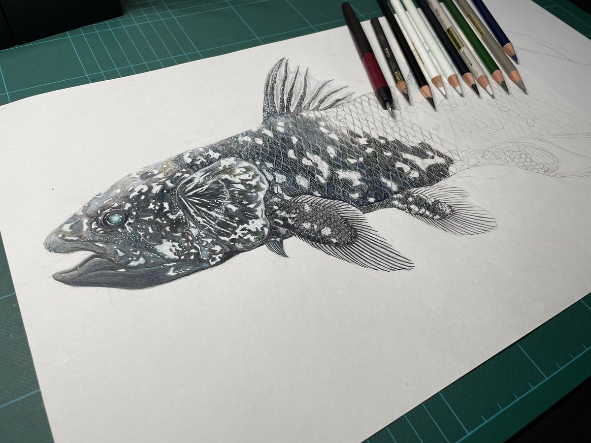 4 27 ずっと放置してるシーラカンスも今月完成させたいな。 #絵描きさんと繋がりたい #制作過程の写真だけで興味を持ってくれる方へ届け #色鉛筆画 #シーラカンス 21/09/07 23:06