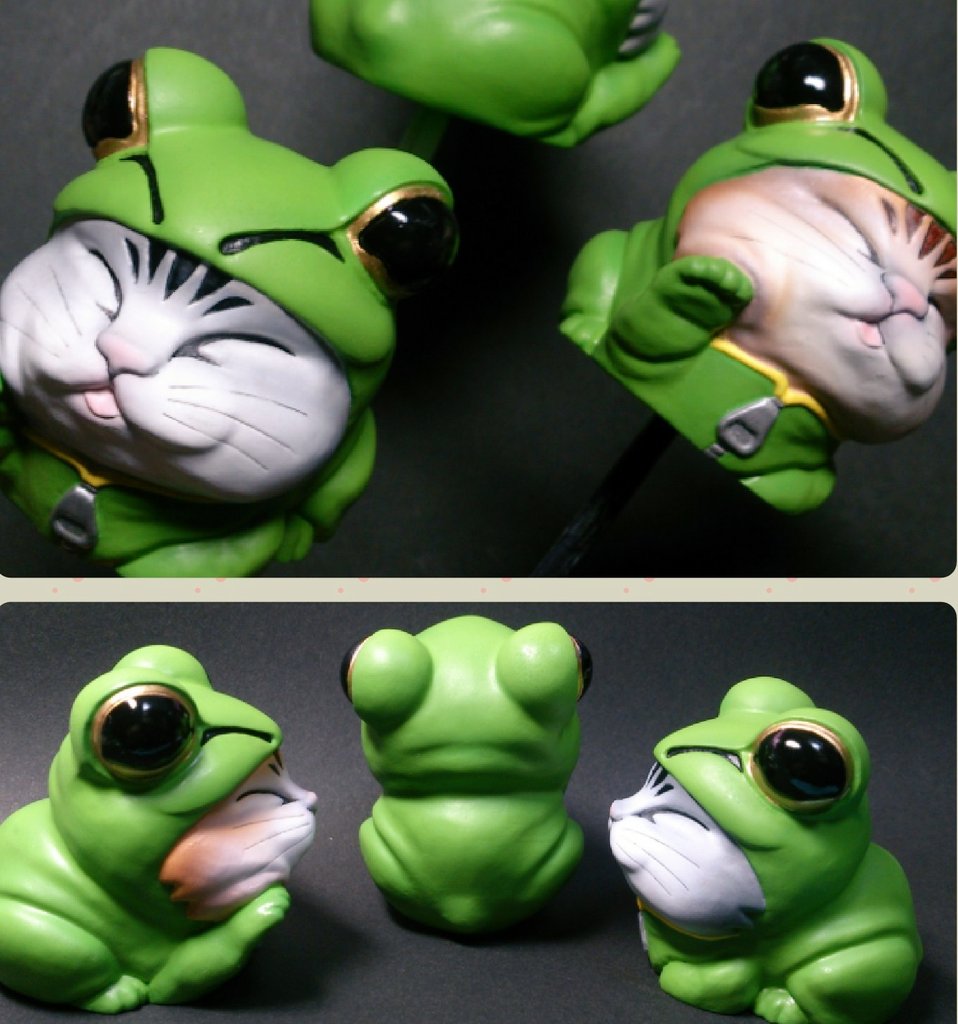 4 28 #世界猫の日 だそうで 毎度同じ子達ですが😅 ケロリストな招き猫 ただの #コスプレ している #猫 なので空想上の生き物じゃないから #いきものフェス に連れて行く予定 #世界ねこの日 #ハンドメイド #ドール 22/08/08 10:01